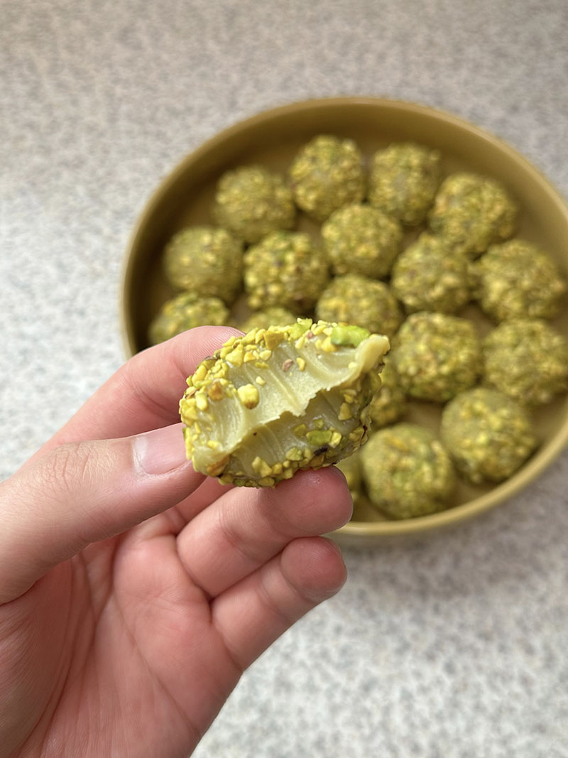Coated in crushed pistachios for crunch.